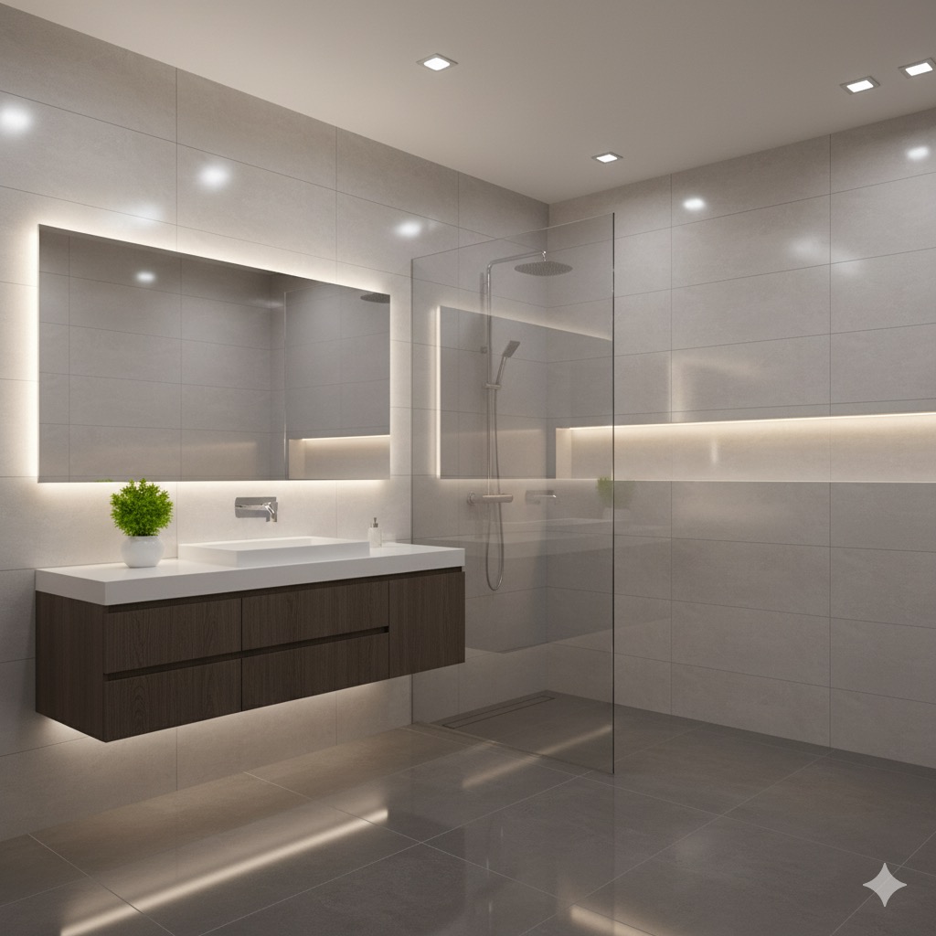 • For small bathrooms: Use light-colored, glossy, or large-format tiles for a spacious feel.